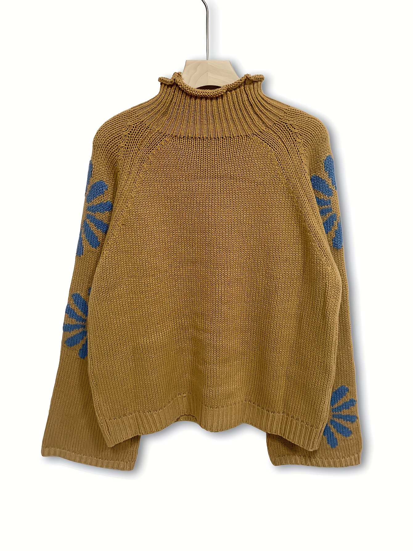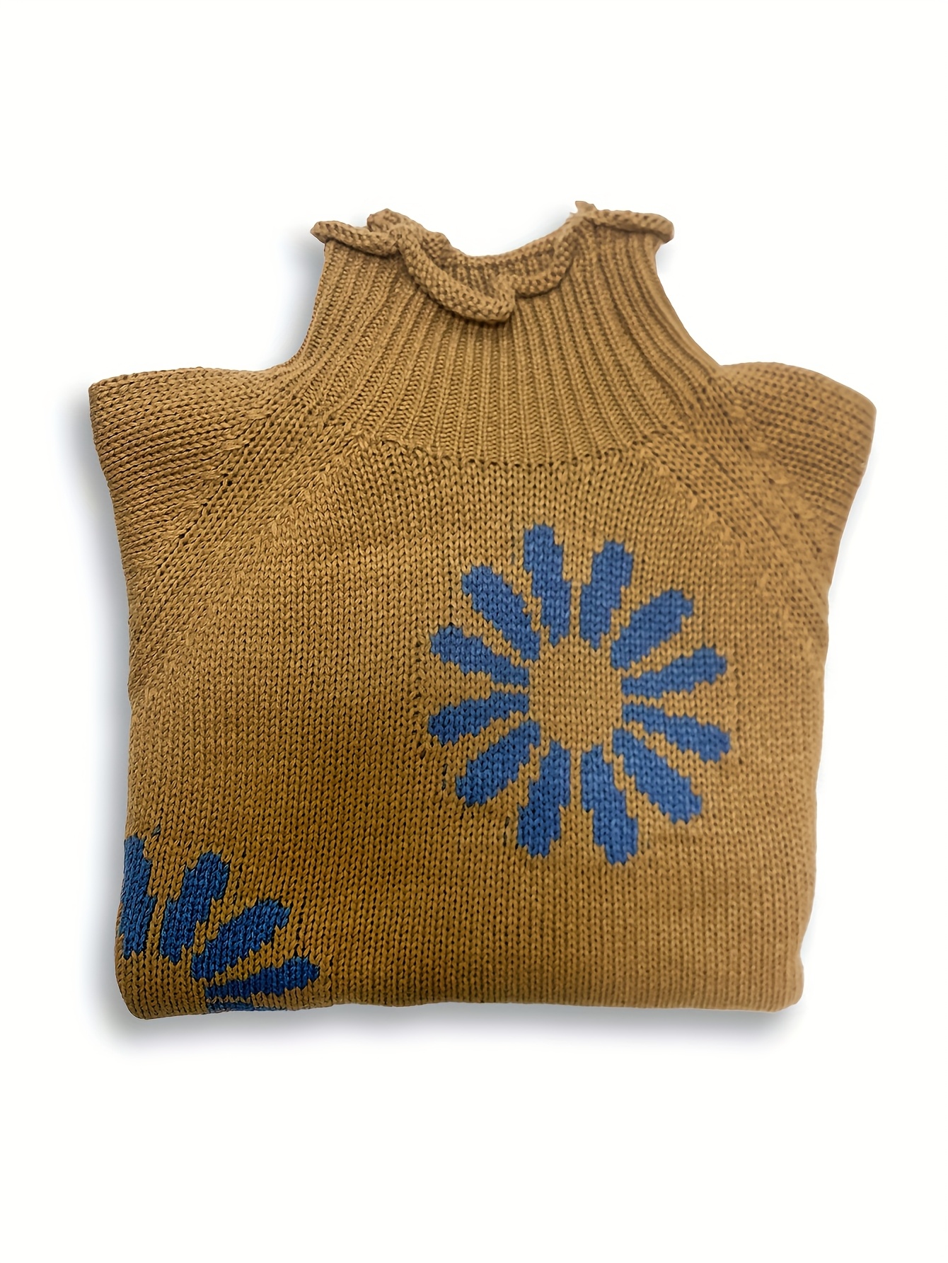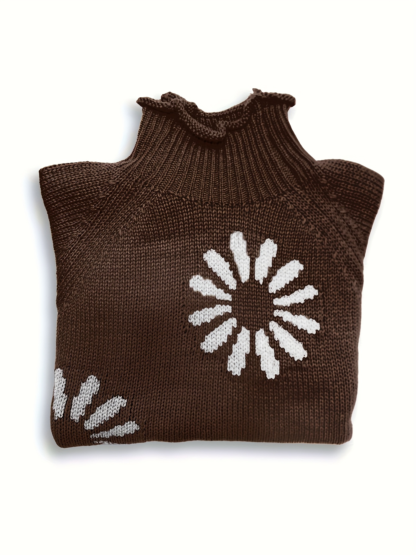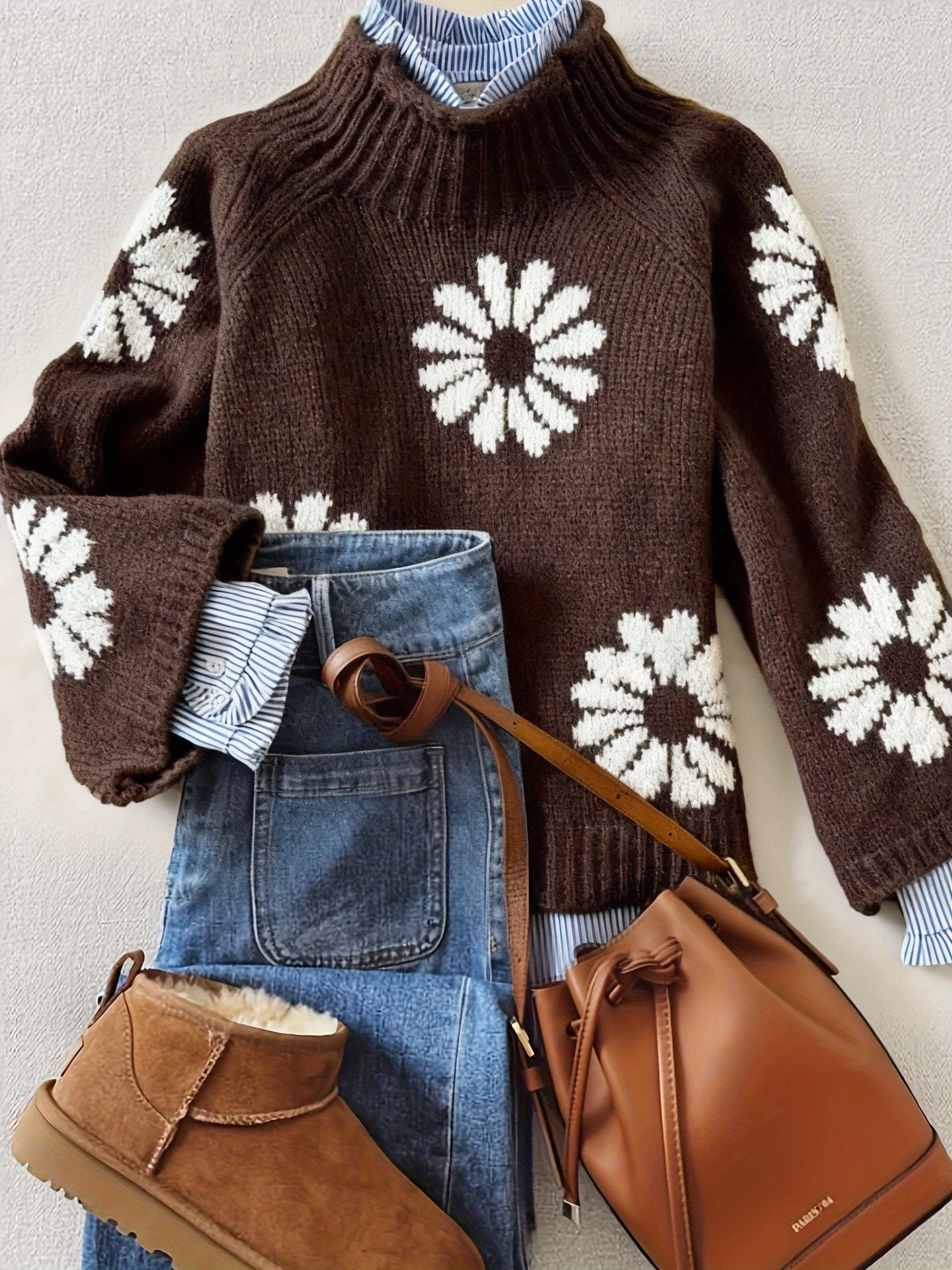 Women'S Elegant Floral Sweater - Long Sleeve High Neck Pullover with Brown & Flower Pattern, All-Season Layering Top for Everyday & Formal Outfits - Women'S