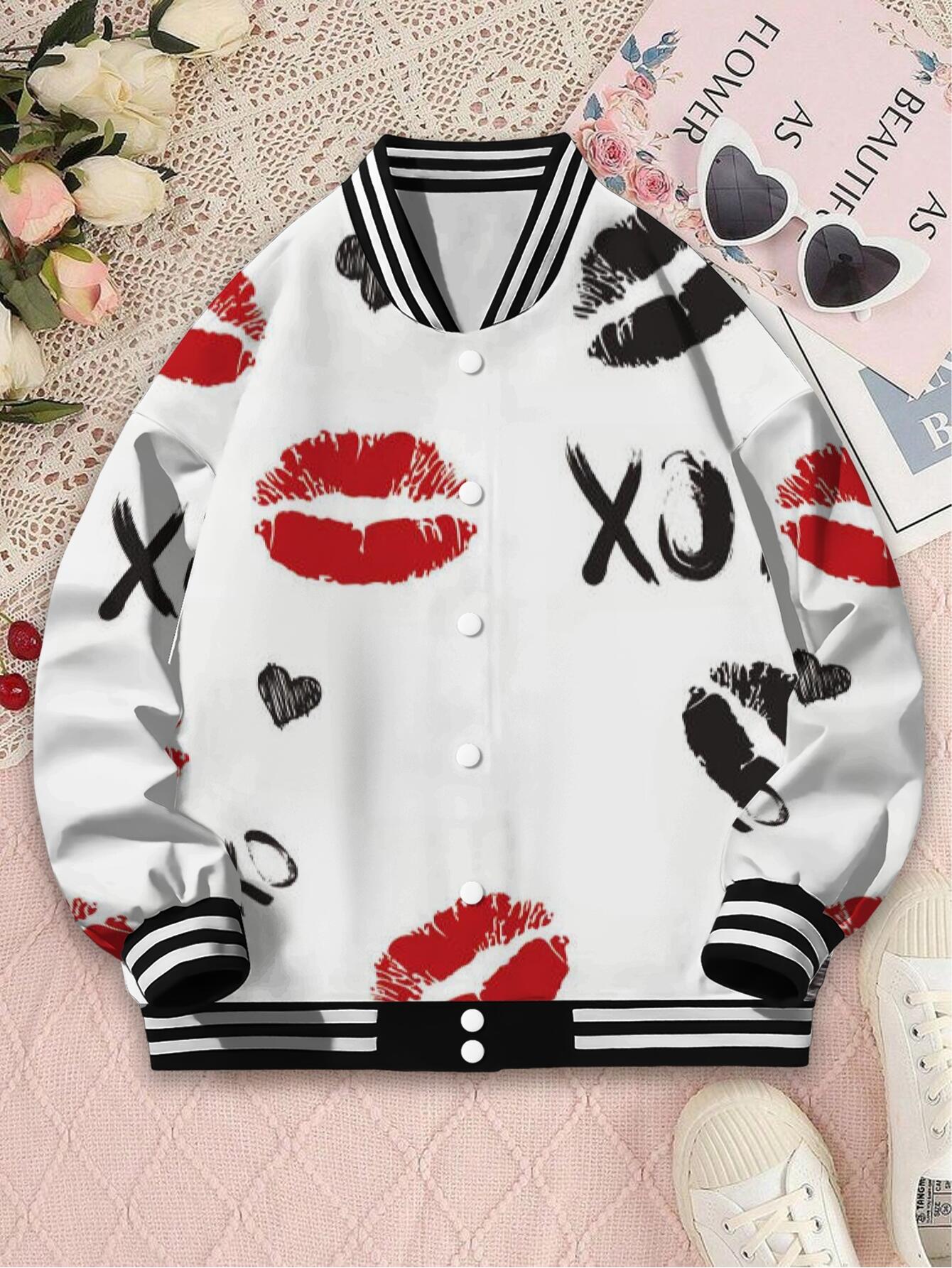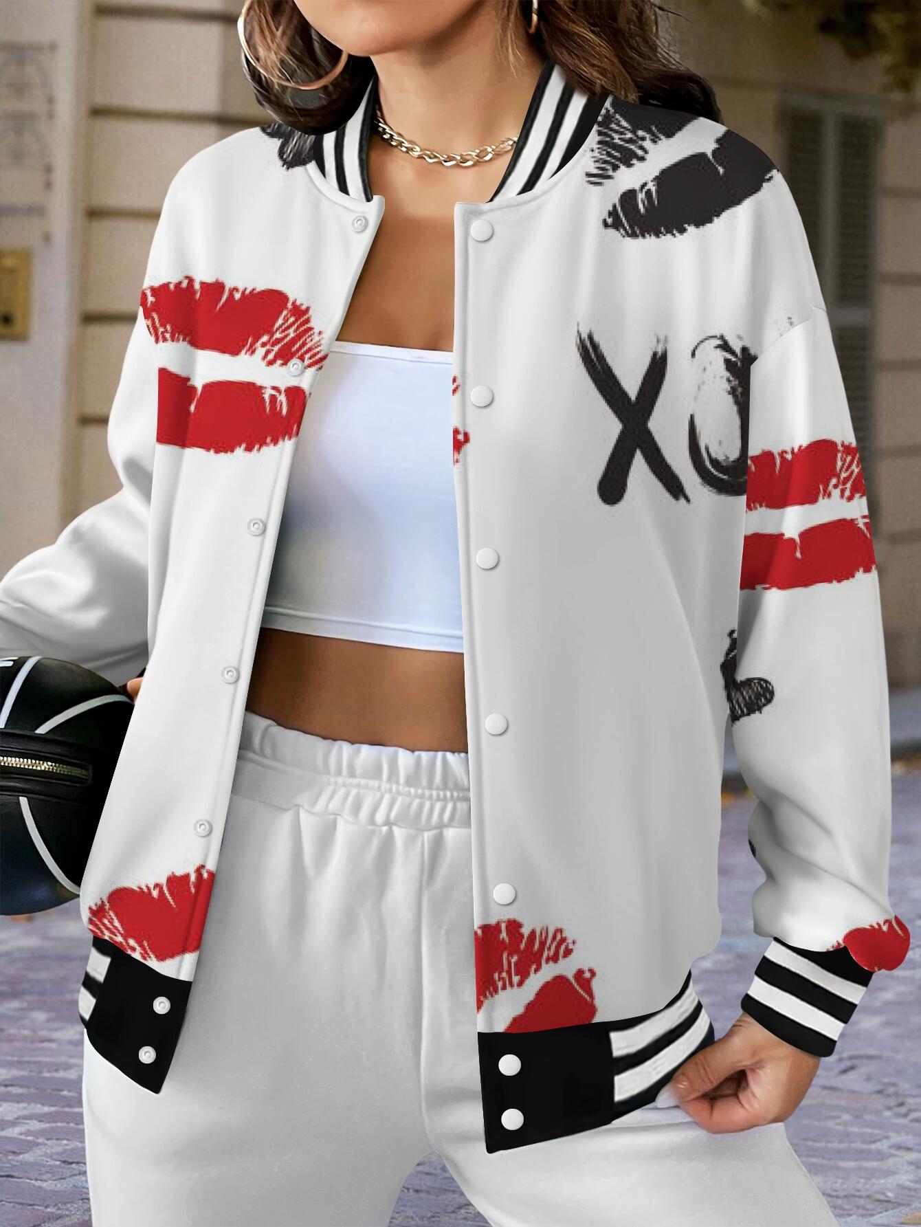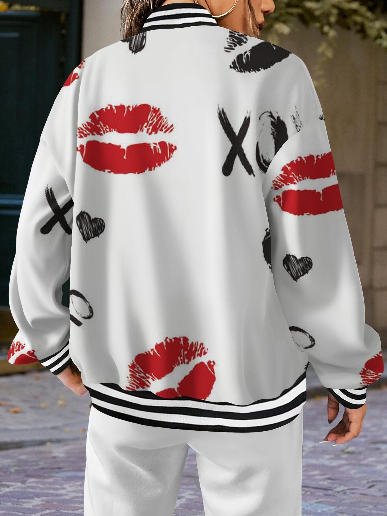 Plus Size Women's White XOXO Lip Print & Red Lips Heart Pattern Baseball Jacket - Cute Kiss Hug Design with Lipstick Kisses & XOXO Logo, Single-Breasted Long Sleeve Winter Coat, Casual Outerwear for Valentine's Day Gift