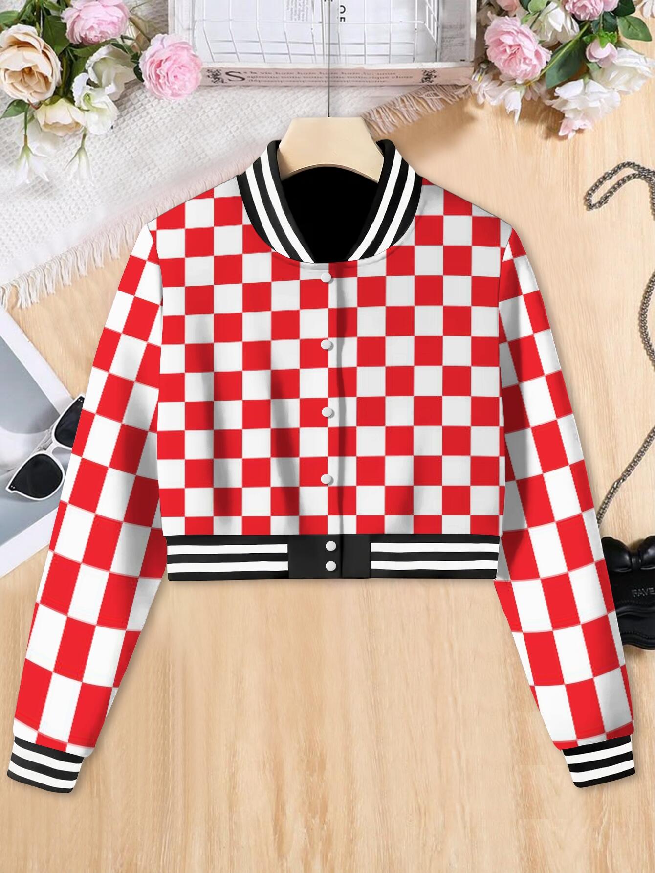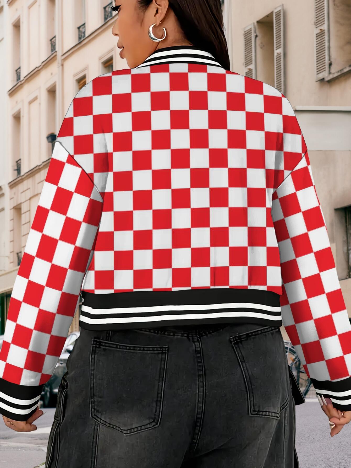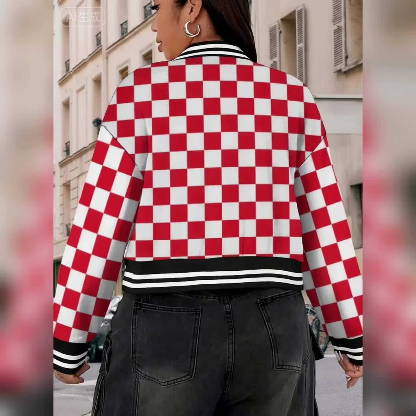 Women's & Unisex Retro Red White Checkered Baseball Jacket - Oversized Long Sleeve Gingham Top, Casual Streetwear Party Festival Outfit, Autumn Winter Warmth, Large Size Comfort Fit, Easy Care Hand Wash/Dry Clean (No Belt/Hardware), Seasonal Fashion, Vintage Aesthetic, Comfortable Fabric, Checkered Top, Fashion Enthusiasts