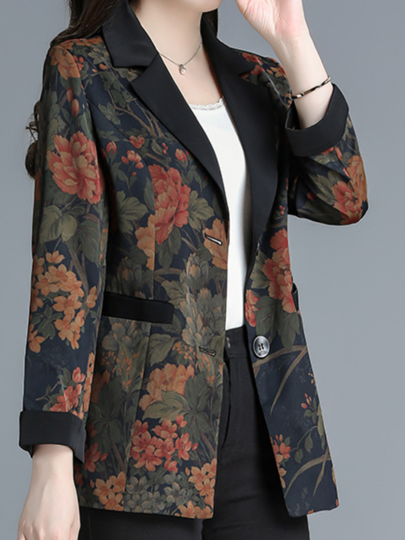 Plus Size, Scacto Women's Vintage Floral print Blazer Jacket - Elegant Lapel Collar & Belted Waist, Single-Button Front, Dropped Shoulder - Winter Formal Party Wedding Attire, Hand Washable Statement Piece for Special Occasions