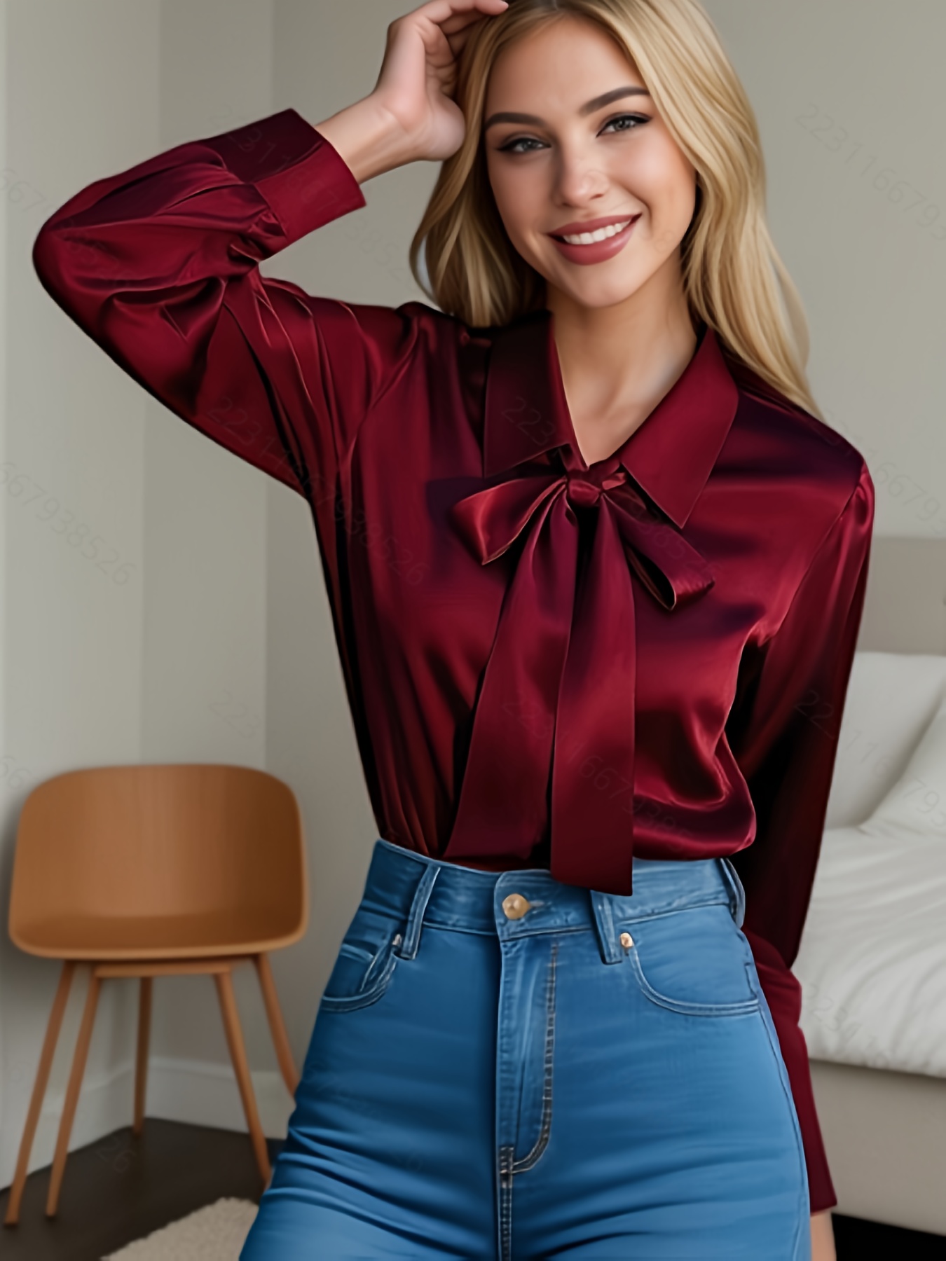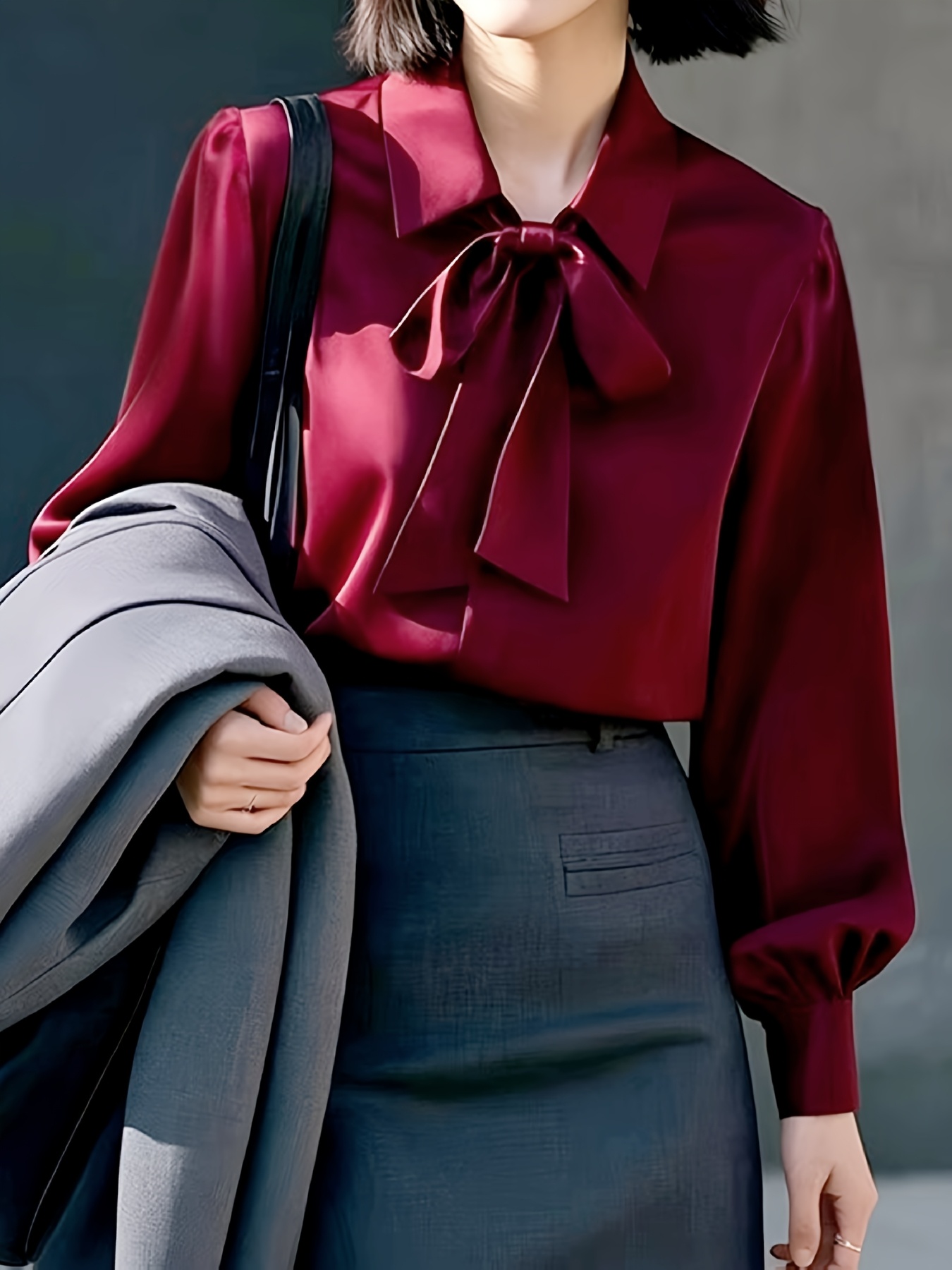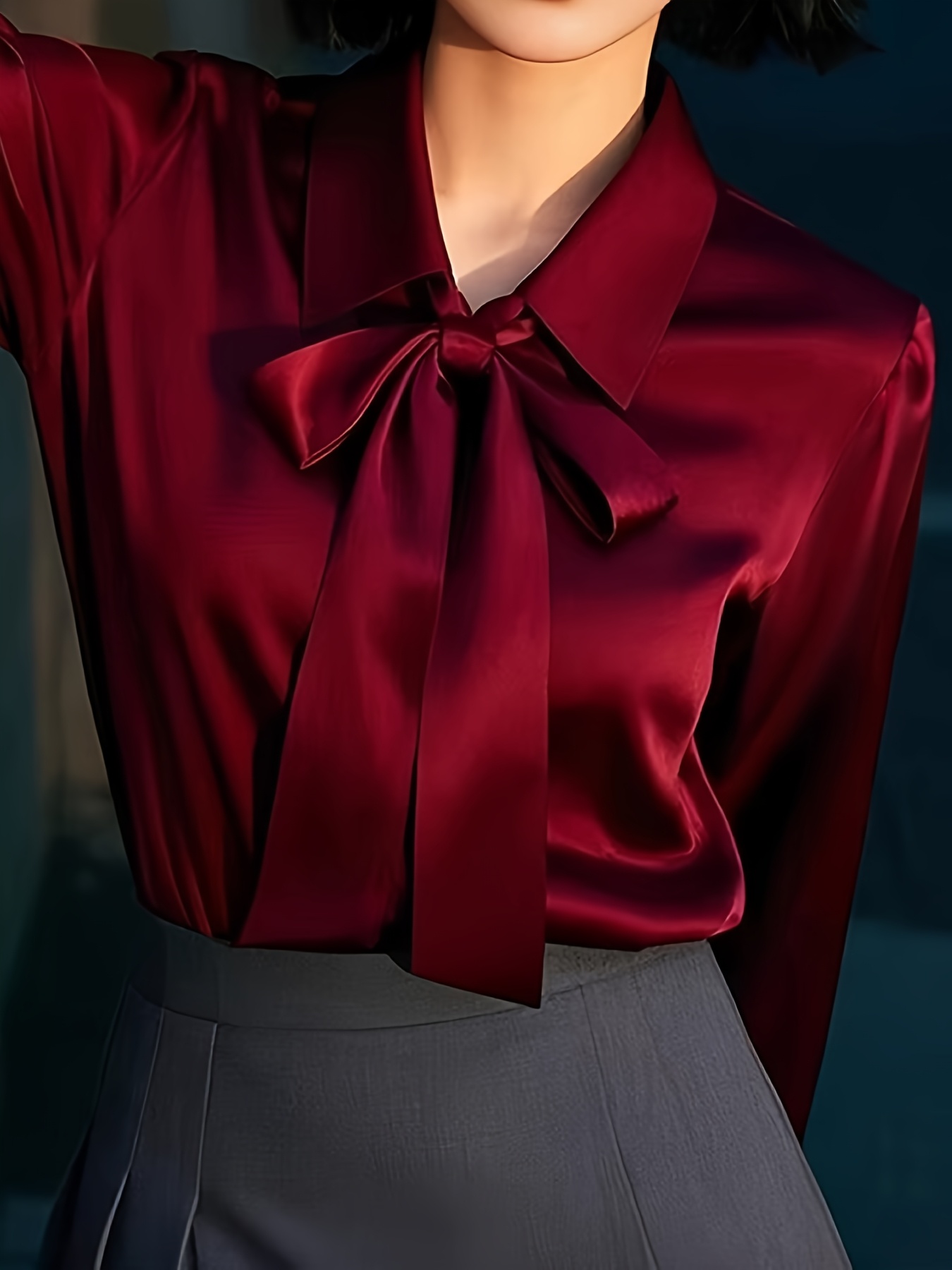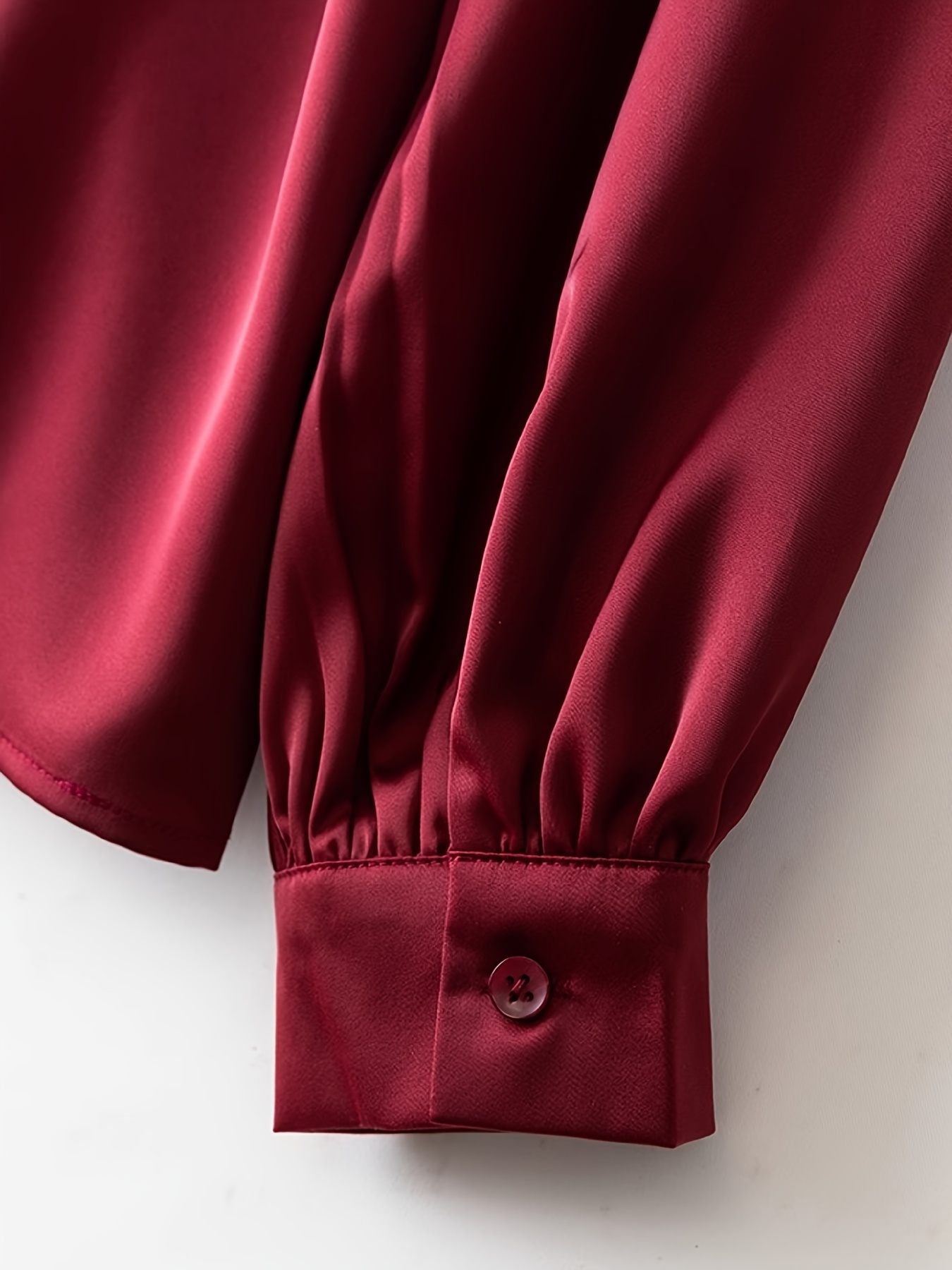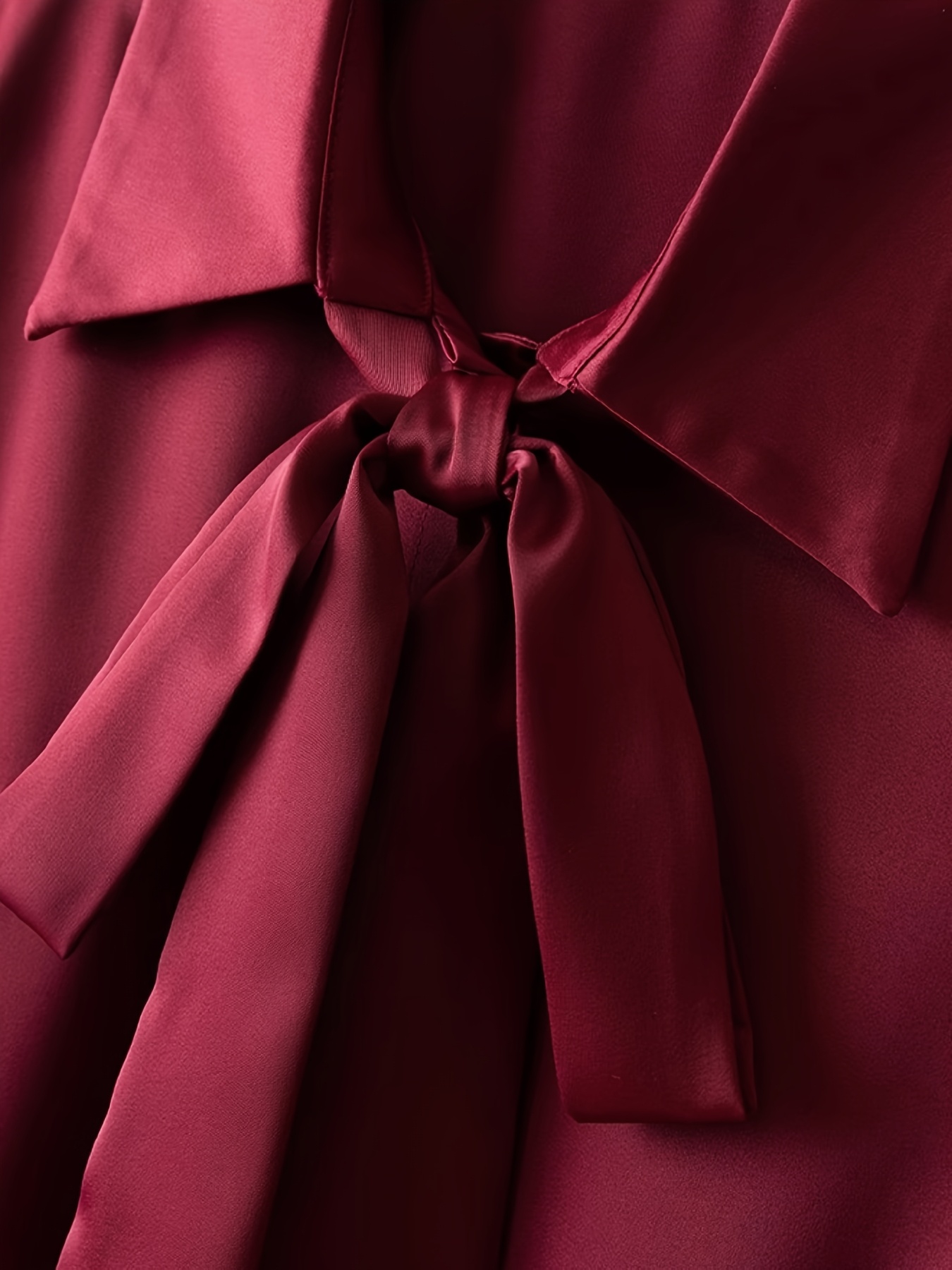 [Burgundy Satin Blouse] Long Sleeve Women's Elegant Burgundy Satin Blouse | Non-Sheer Polyester, 173gsm, Bow Tie Detail, Perfect for Spring/Autumn Office or Formal Wear