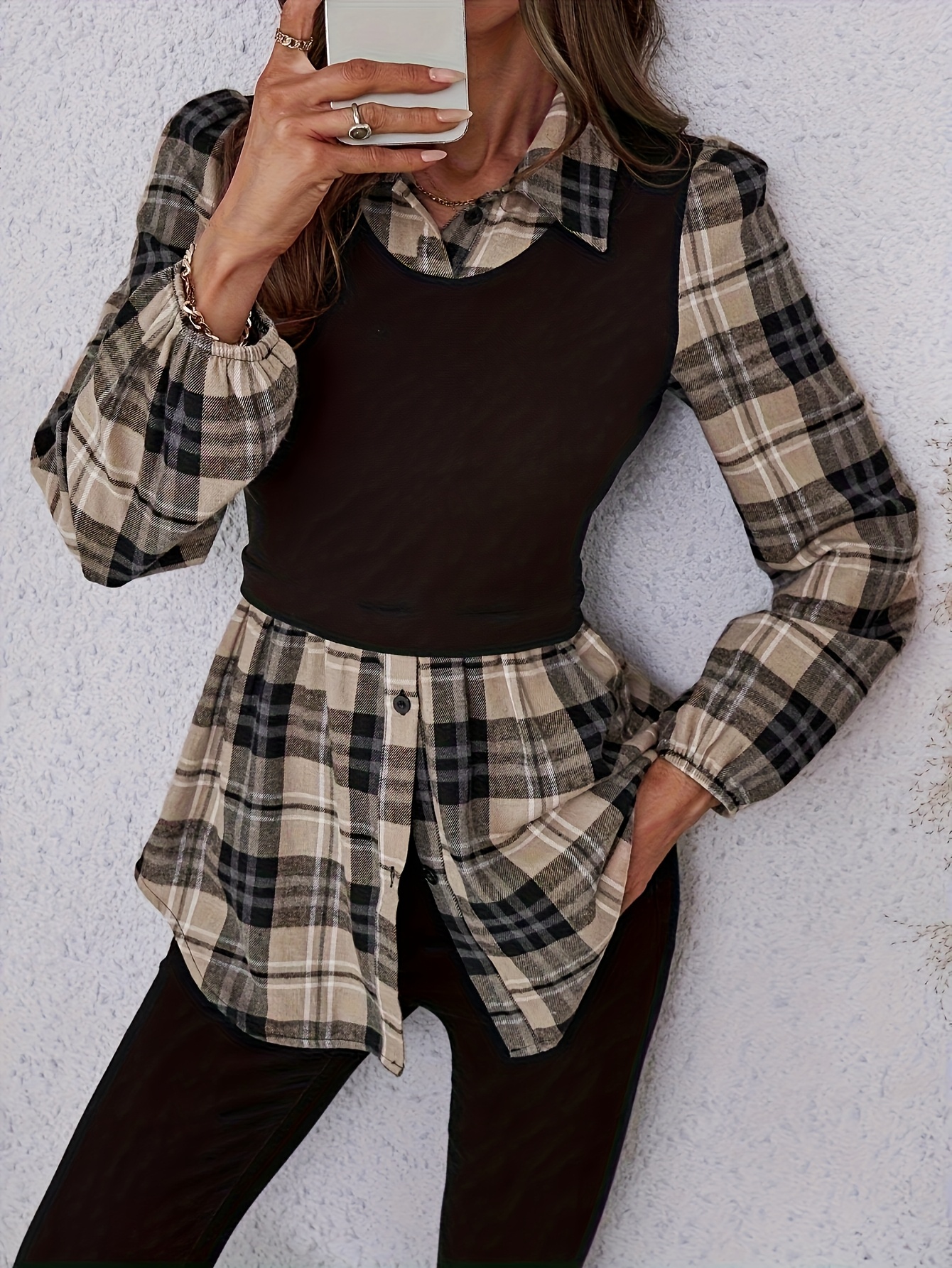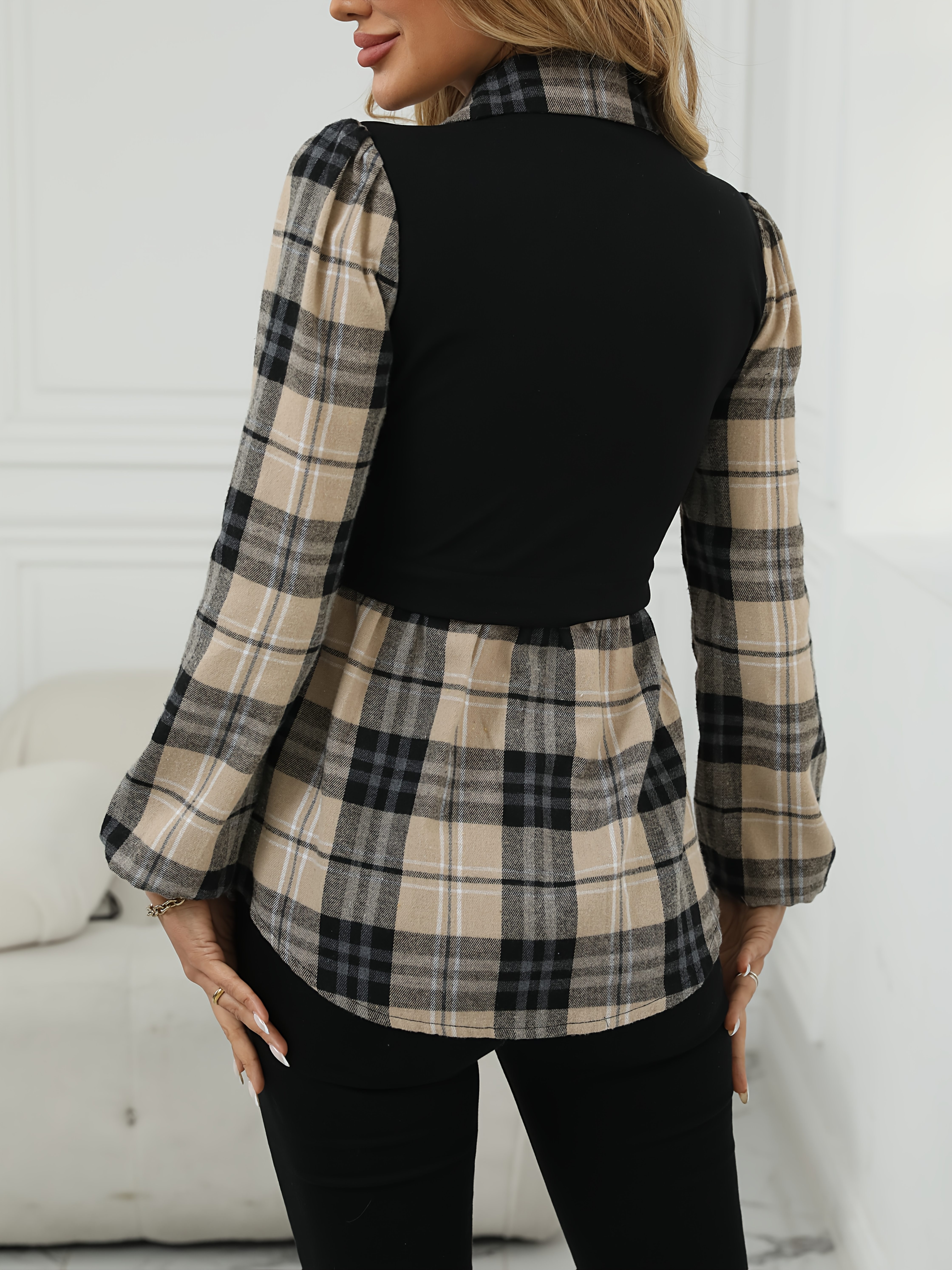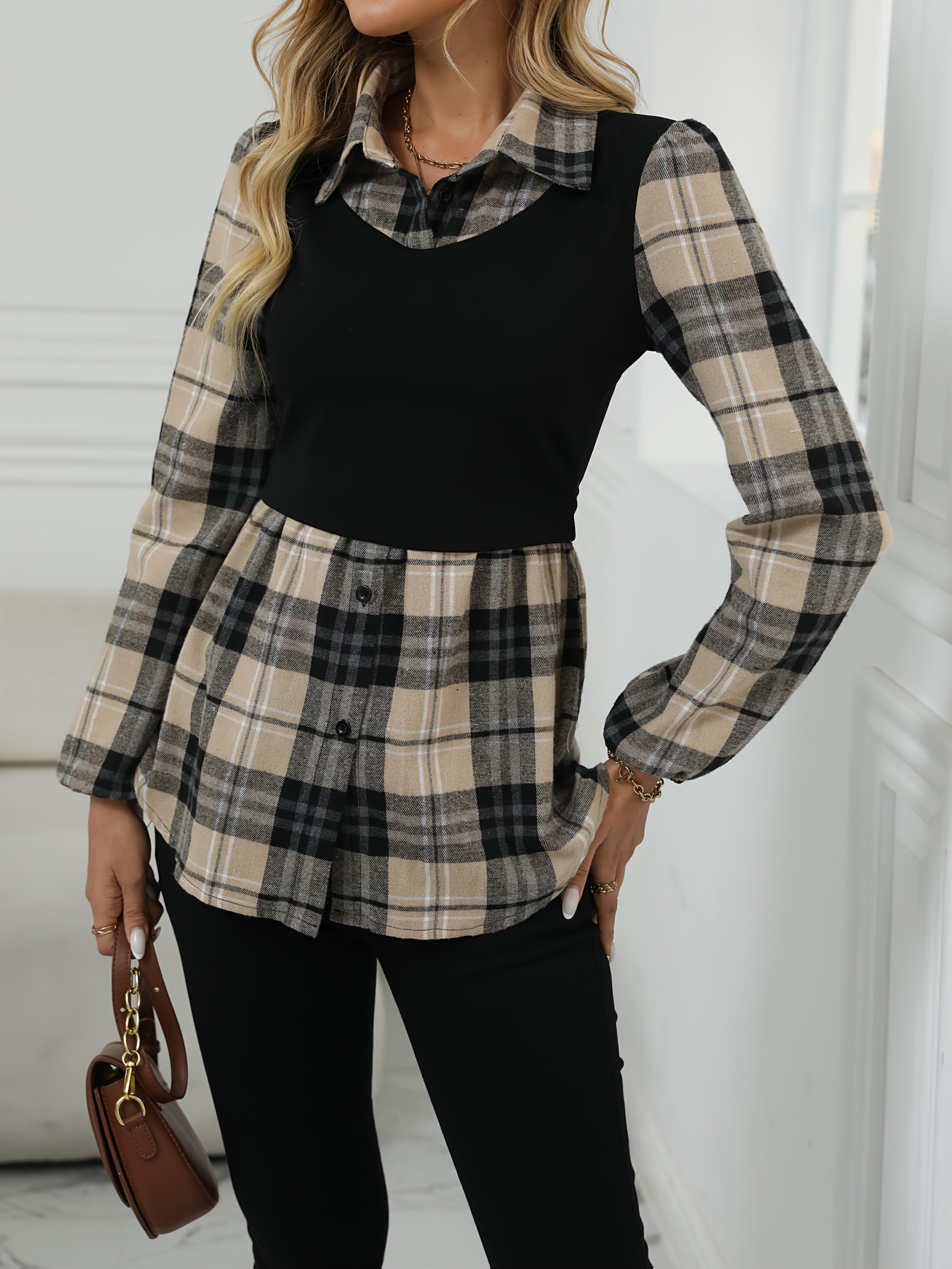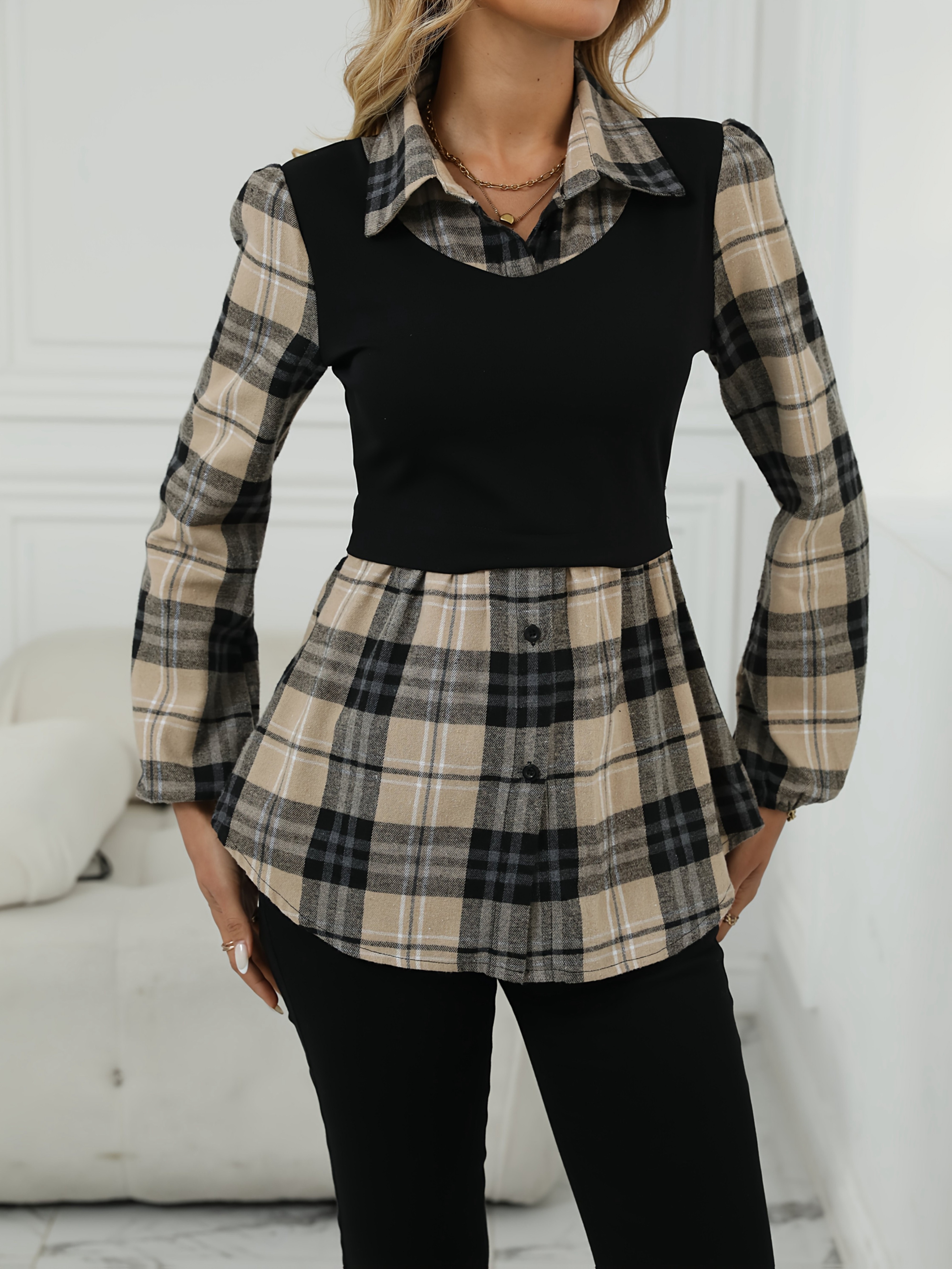 [Elegant Plaid Shirt] Elegant Geometric Plaid Print Button-Up Shirt for Adults - Autumn Casual & Formal Wear with Classic Collar, Machine Washable, Black & Beige Contrast