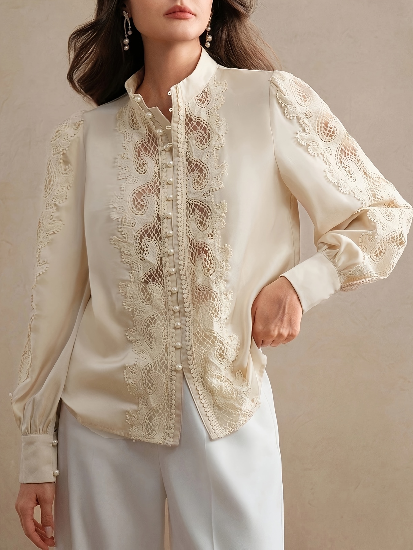 Women's Elegant Lace-Trimmed Semi-Sheer Long Sleeve Shirt - Stand Collar Button-Up Blouse with Chest Pockets, Lightweight 3-Season Top for Spring Summer Fall, Machine Washable, Casual Chic Wear, Sophisticated Detailing