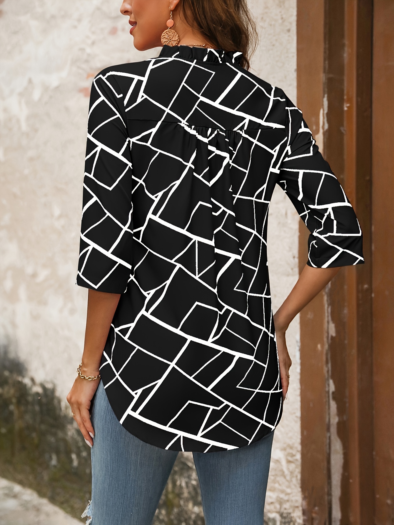 1pc Elegant Women'S Geometric-Patterned V-Neck Half Sleeve Shirt - Polyester Woven Pullover with Regular Fit for Spring/Summer/Fall