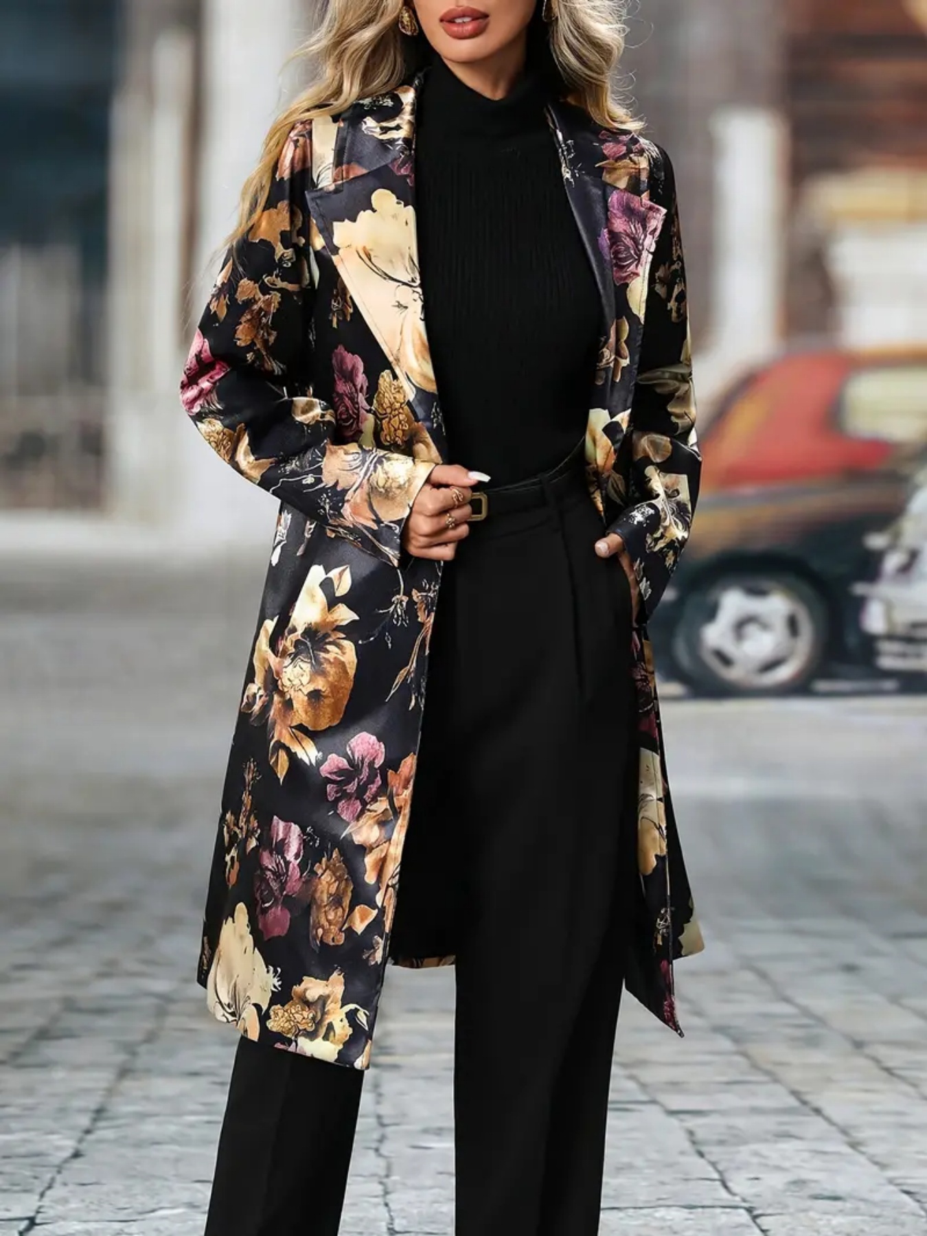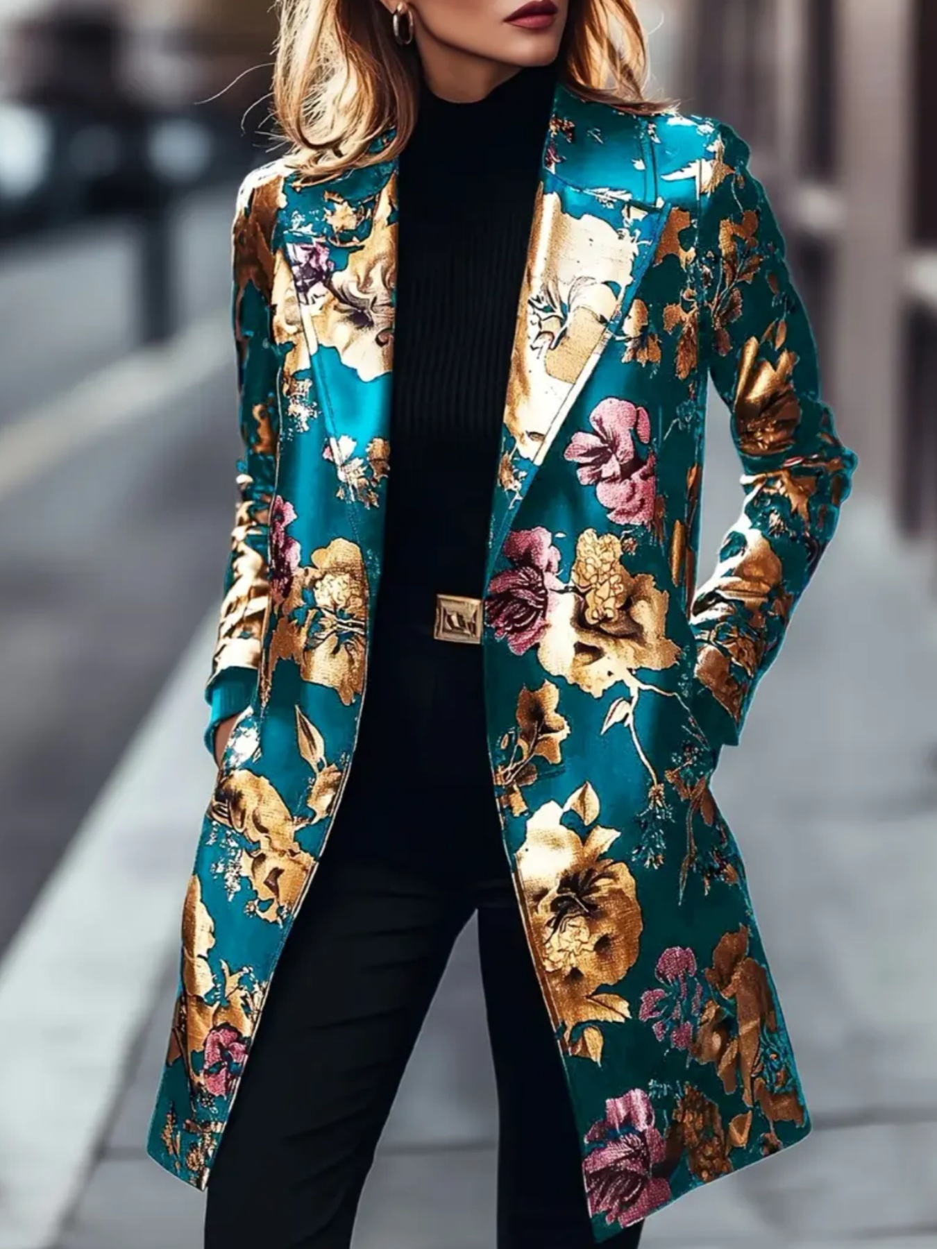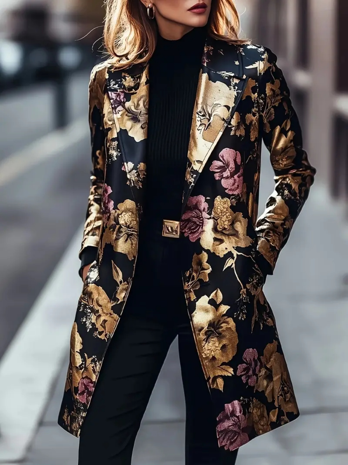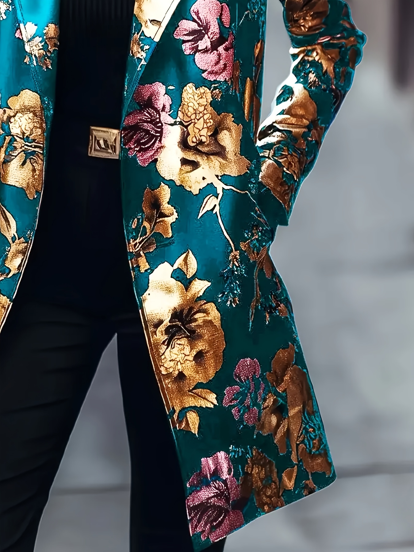 Plus Size - Plus Size Women'S Elegant Floral Print Blazer - Long Sleeve, Single-Breasted, Non-Stretch Fabric, Lapel Collar, Regular Fit, Fall/Winter Casual, Casual Wear Blazer | Floral Print Blazer | Nonstretch Fa