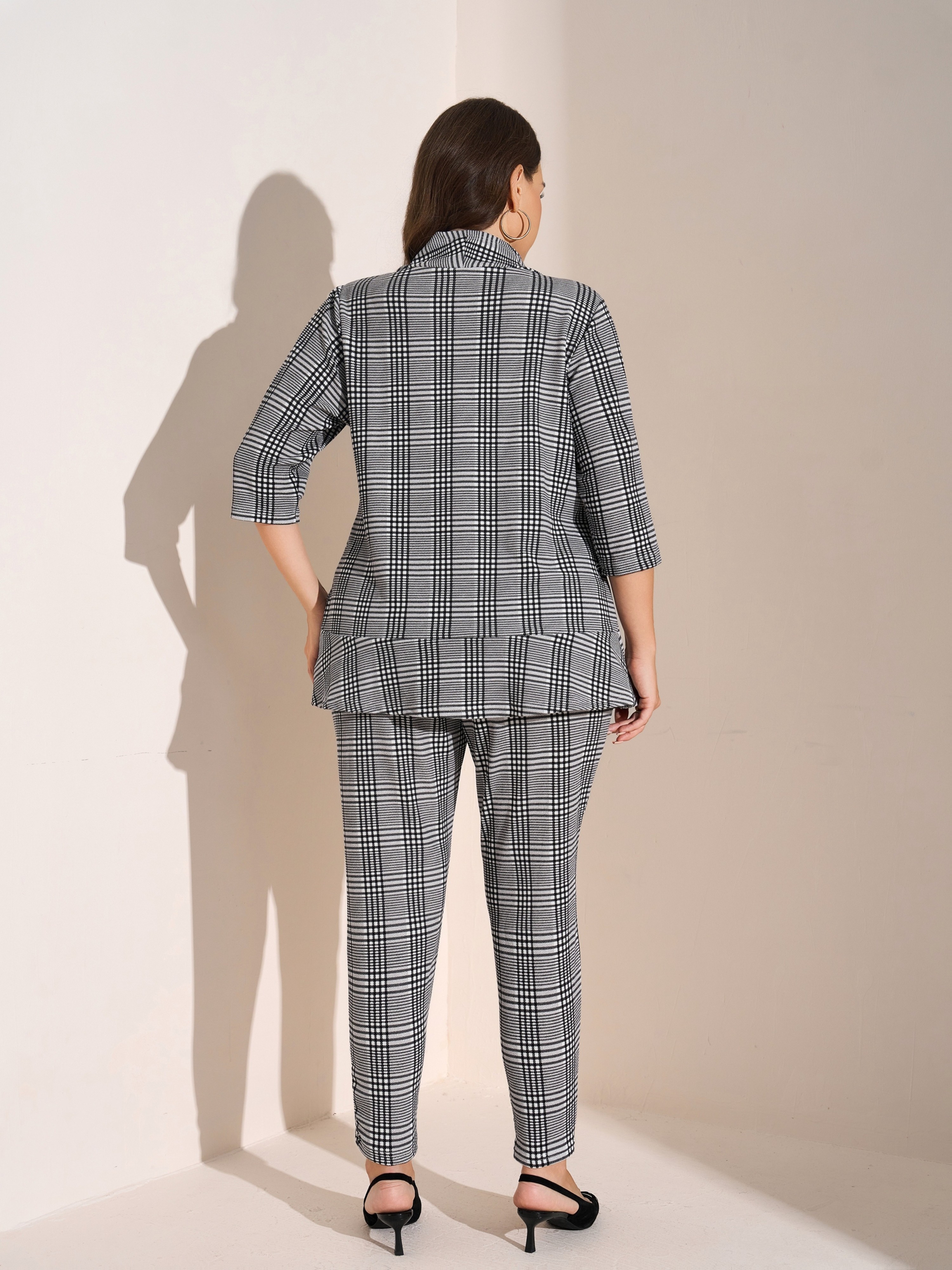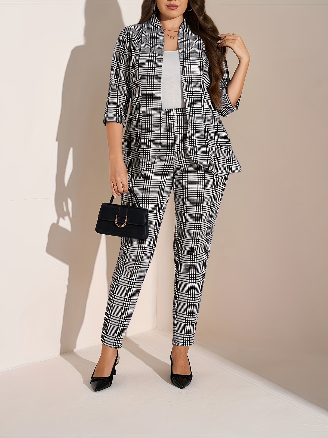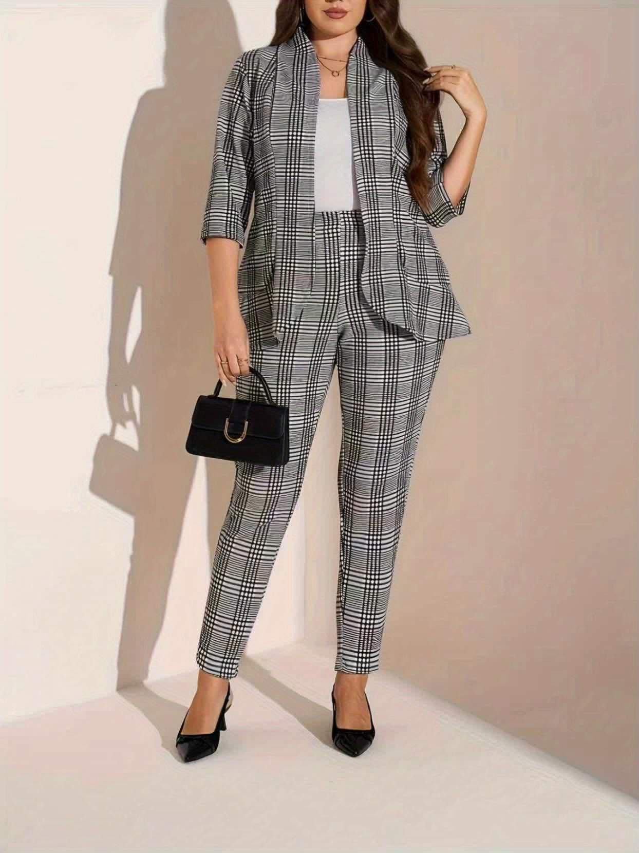 Plus Size - Women'S Plus Size Casual Plaid Suit Set - Open Front Blazer & Pants, Light Gray & White Checkered Pattern, Long Sleeve, Button-Up, Spring/Fall Office or Casual Attire, Casual Attire|Checkered Pattern|Slight Stretch Fabric