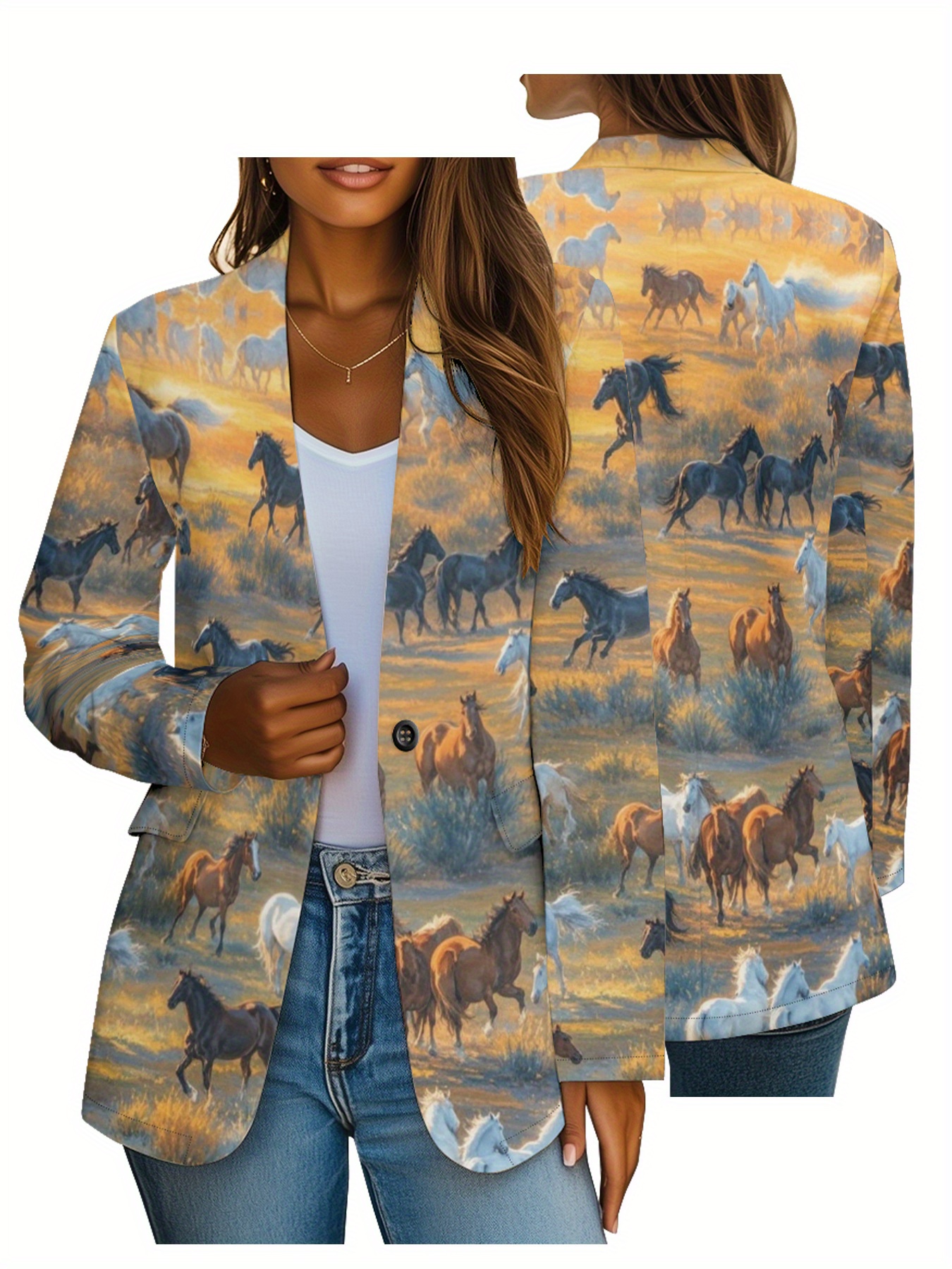 Plus Size, Women's Western Cowgirl Print Blazer Jacket - Horse & Cowboy All-Over Pattern (Horses/Tents/Hats) - Soft-Lining Polyester Suit Coat for Casual & Professional Wear, Cowboy-Themed Events, Wrinkle-Resistant H-Line Fit (No Belt), Printed Blazers For Women, Jackets For Women, Blazers For Women Elegant Classy, Halloween Plus Size, Casual Blazer For Women, Unusual Clothes For Women, Suits For Women, Halloween Coat, Boho Blazer For Women, Leopard Long Coat, Tops For Women