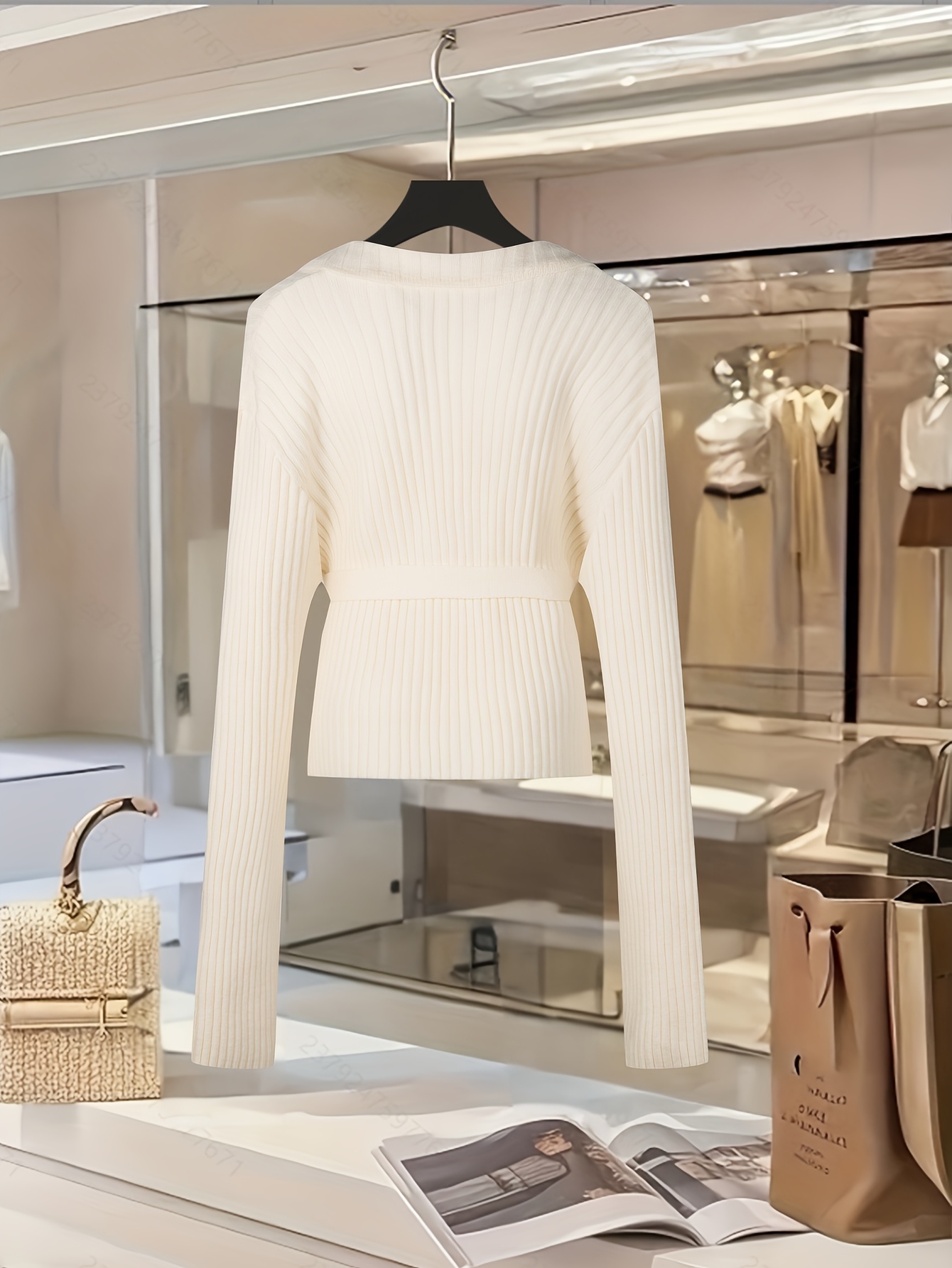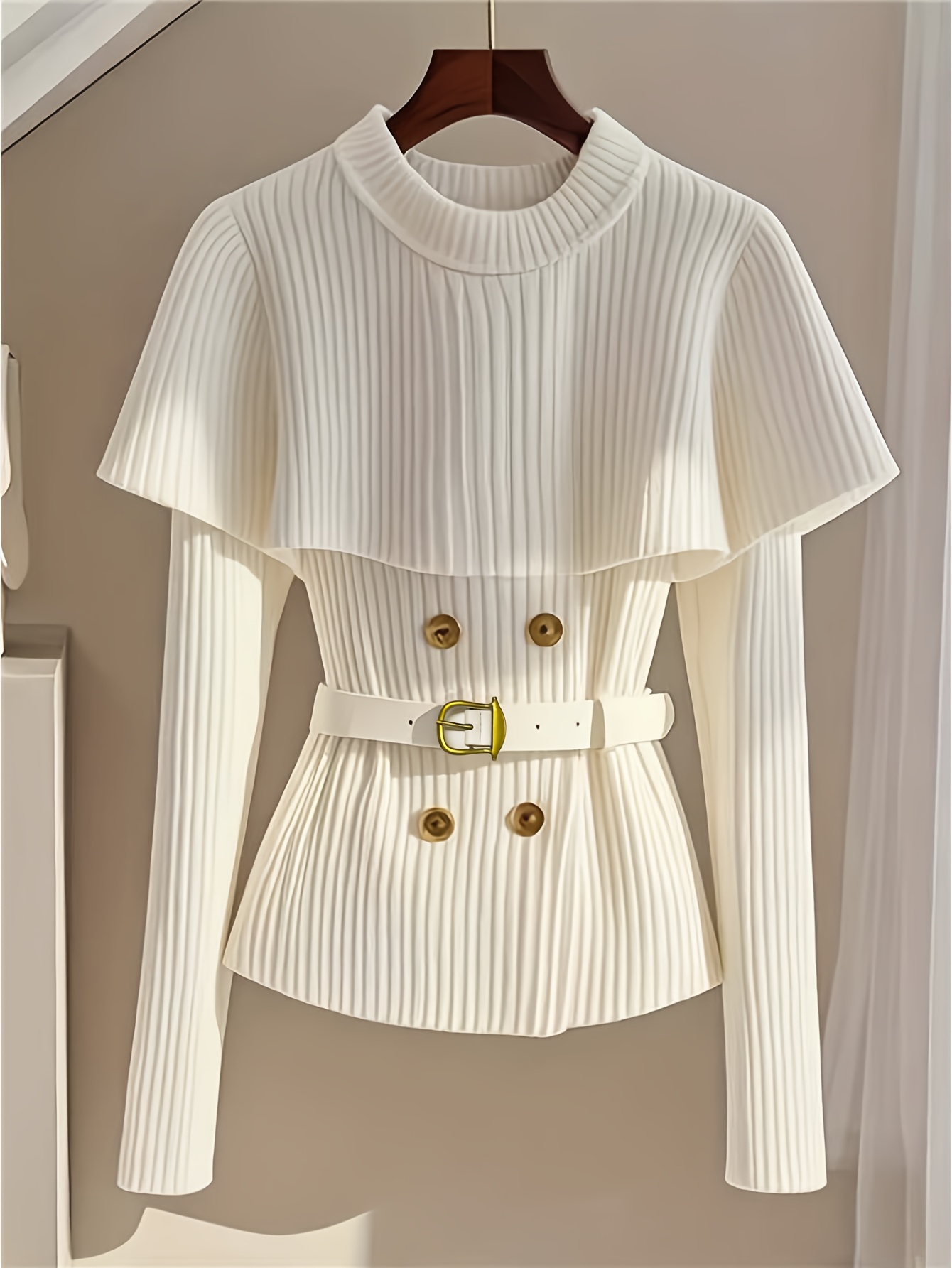 [White Sweater] Soft Acrylic Elegant White Sweater | Round Neck Pullover, Fitted Waist Belt, Ribbed Texture, Golden-Tone Buttons, Fall Winter Women's Chic Top for Casual or Formal Outfits