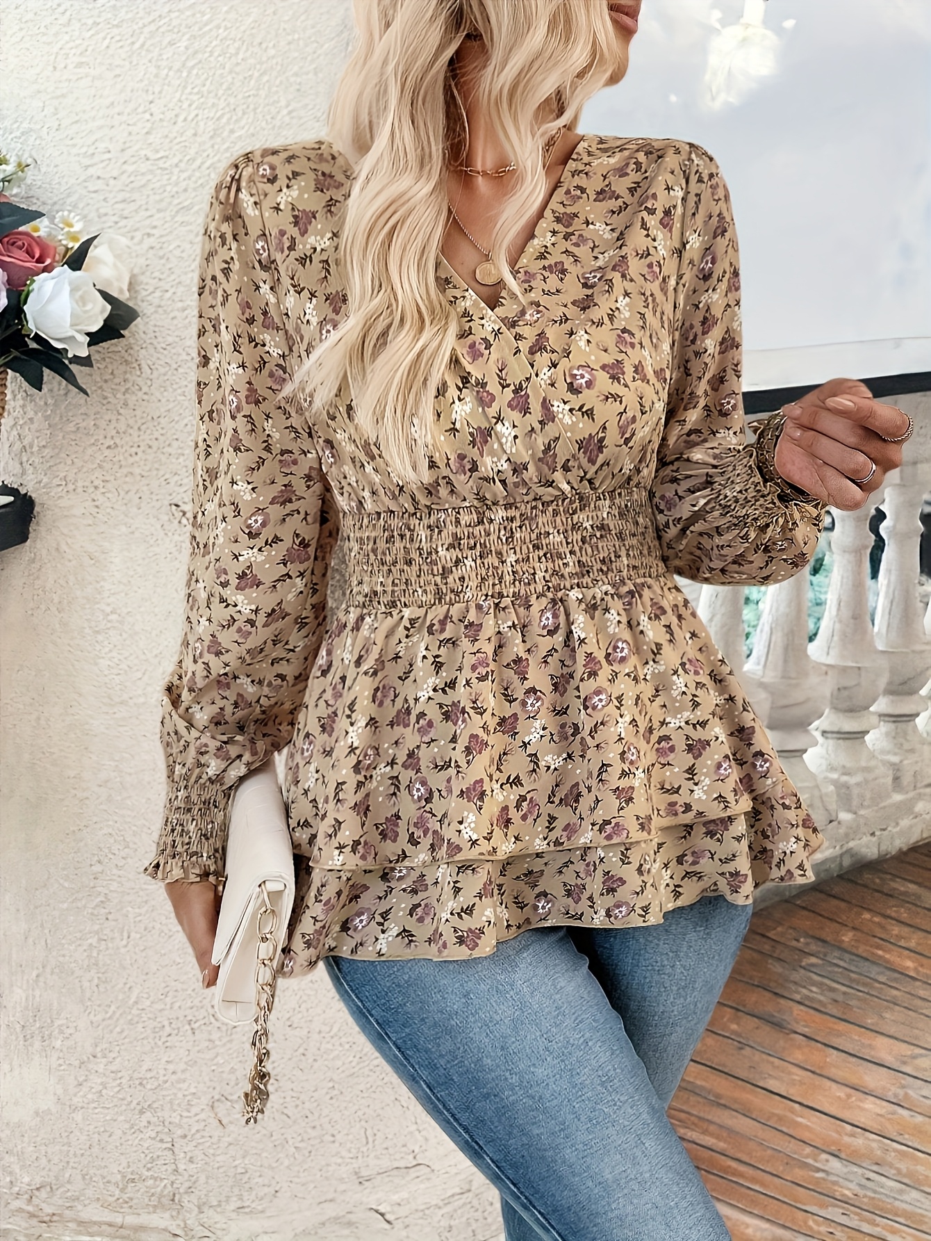 [Retro Floral Print Shirt] 100% Polyester Women's Elegant Retro Floral Print Shirt | Waist-Cinching, Criss Cross Neck, Woven Shirting for Outdoor & Autumn Season