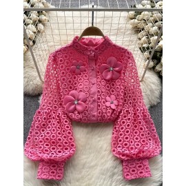 Women's Elegant Lace-Trimmed Semi-Sheer Long Sleeve Shirt - Stand Collar Button-Up Blouse with Chest Pockets, Lightweight 3-Season Top for Spring Summer Fall, Machine Washable, Casual Chic Wear, Sophisticated Detailing