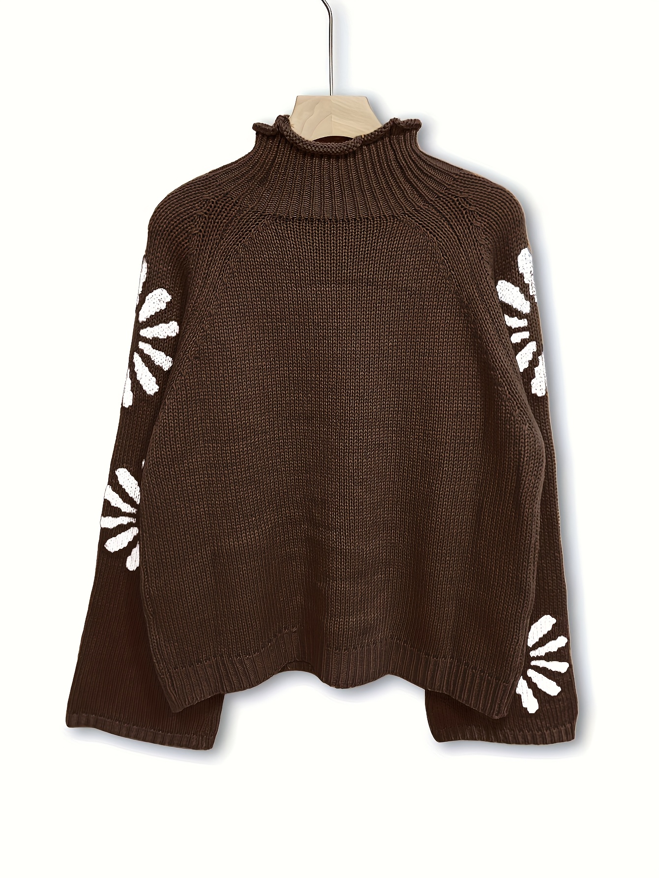 Women'S Elegant Floral Sweater - Long Sleeve High Neck Pullover with Brown & Flower Pattern, All-Season Layering Top for Everyday & Formal Outfits - Women'S