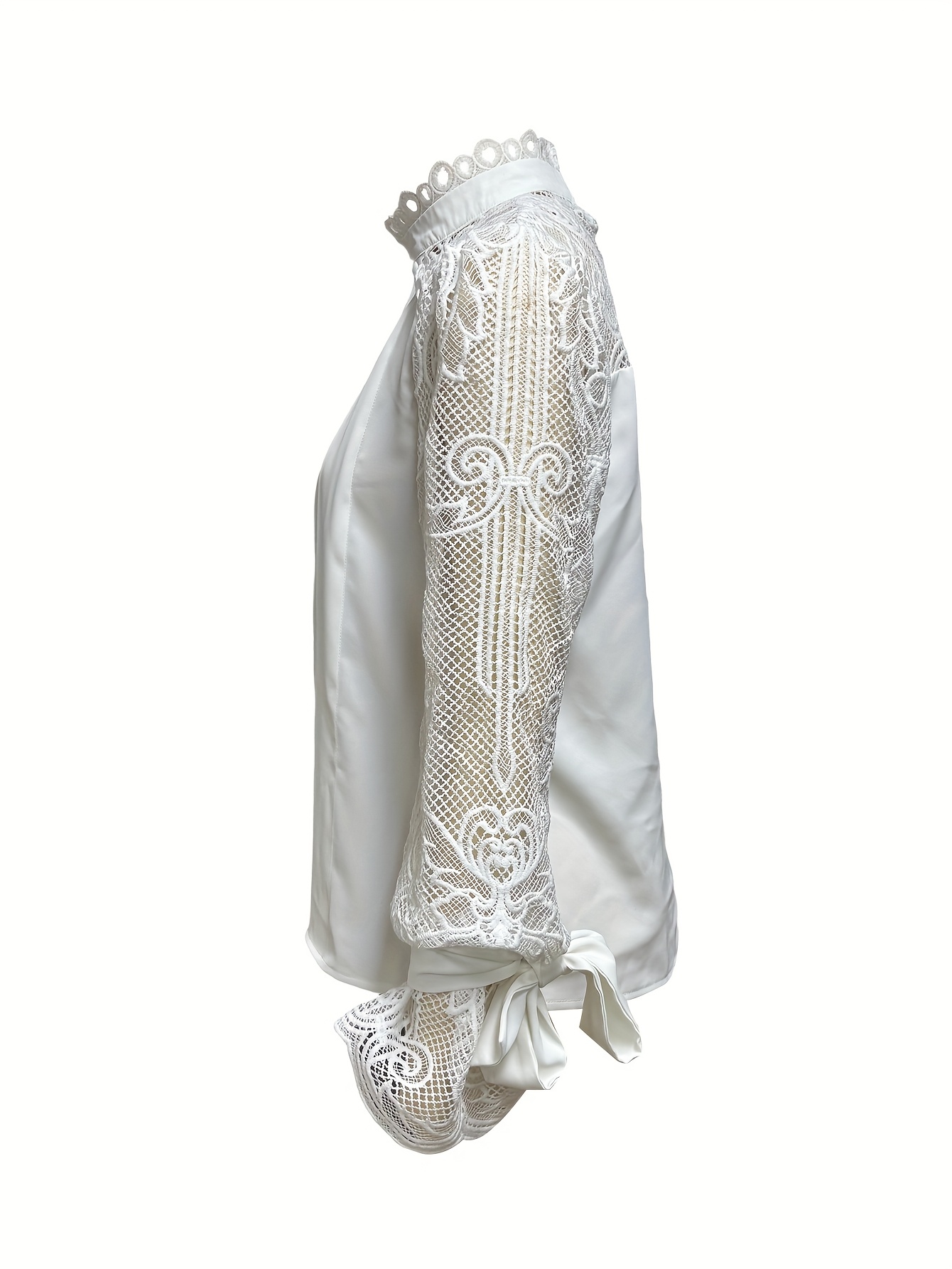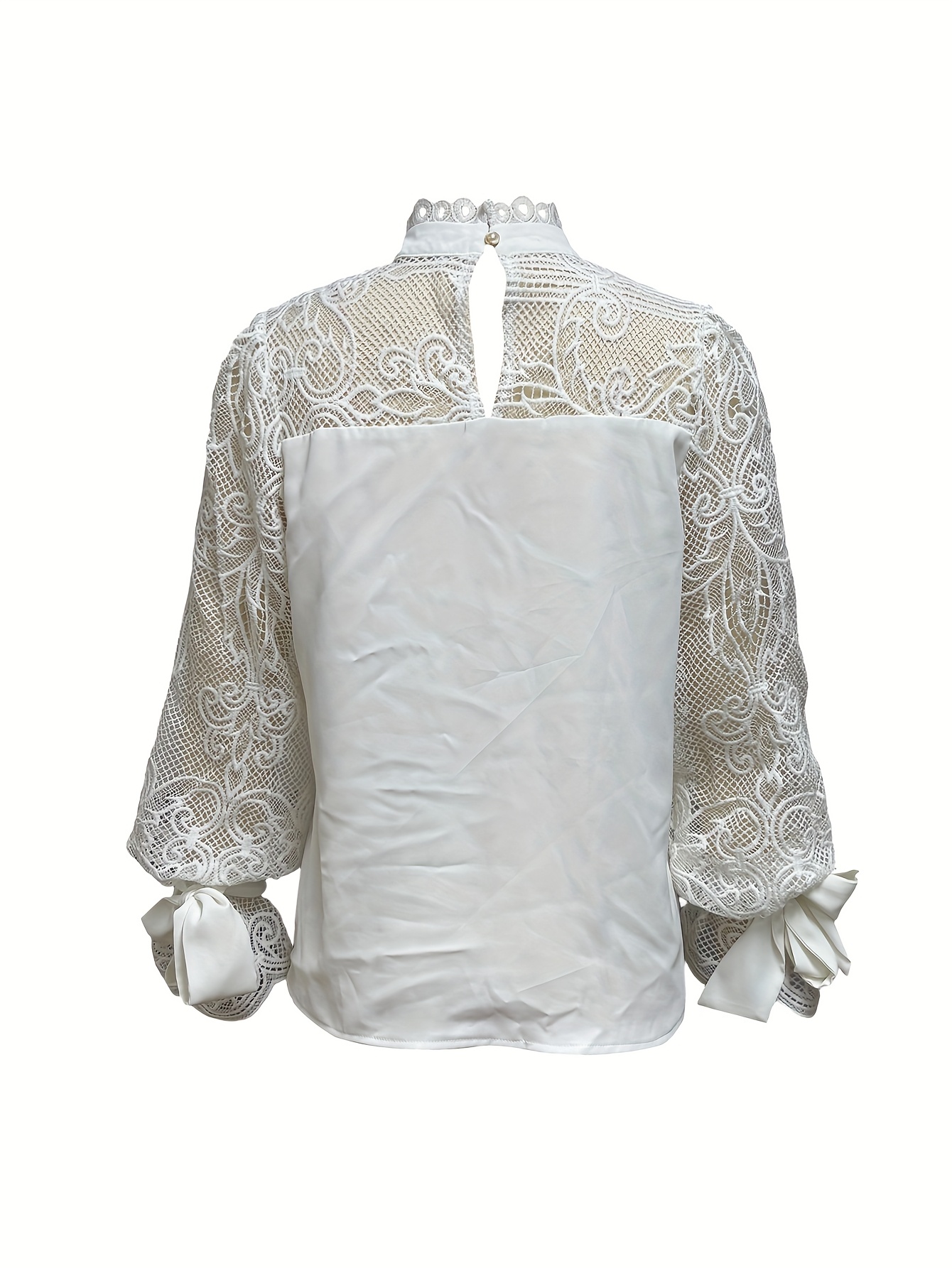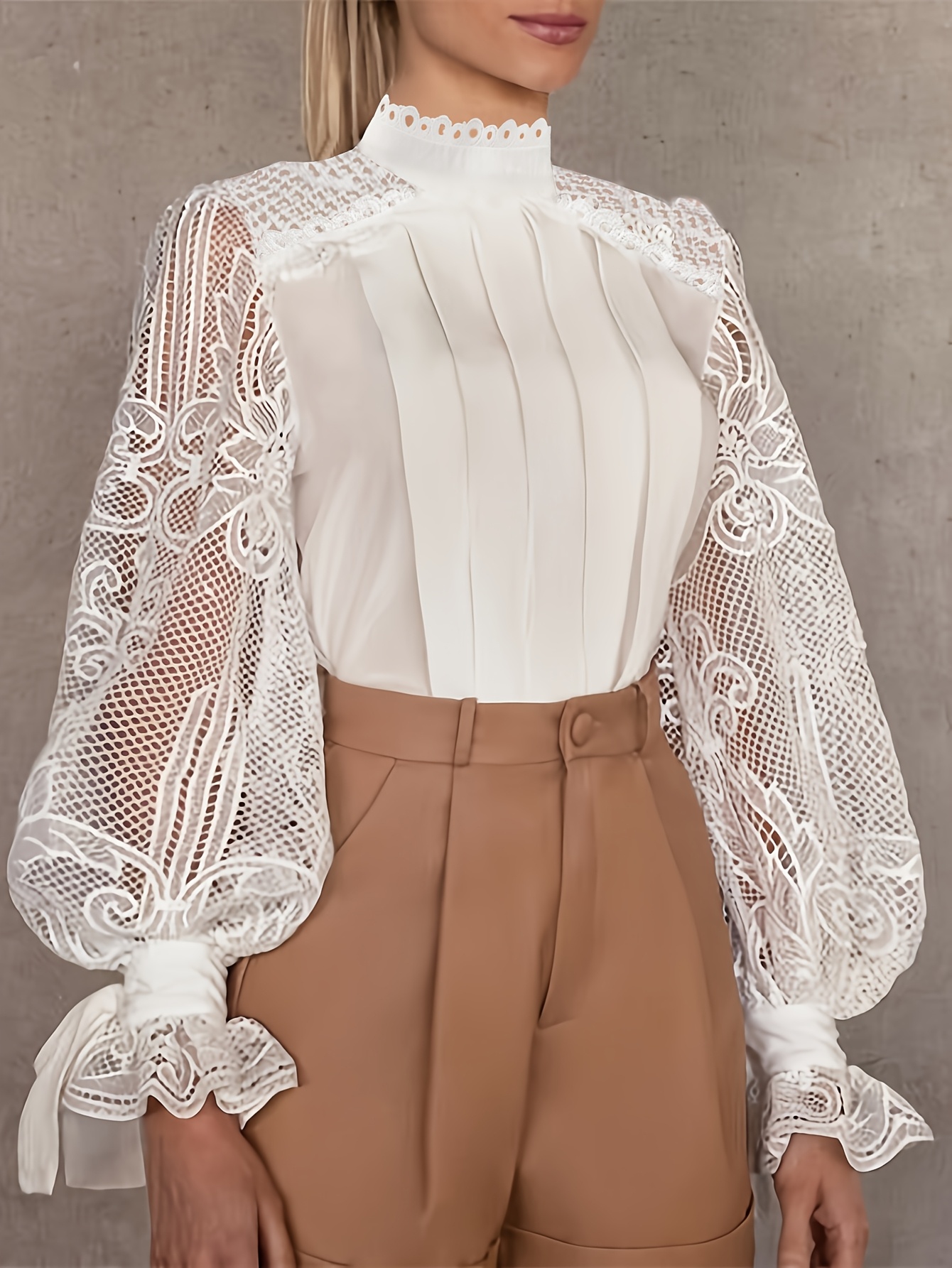 Women'S Elegant Lace-Trimmed Blouse with Puff Sleeves & High Neck - Chic White & Beige Contrast Design, Perfect for Spring/Summer/Fall, Versatile Fashion Top, Spring Summer Fashion, Sophisticated Style, Intricate Lace Detailing