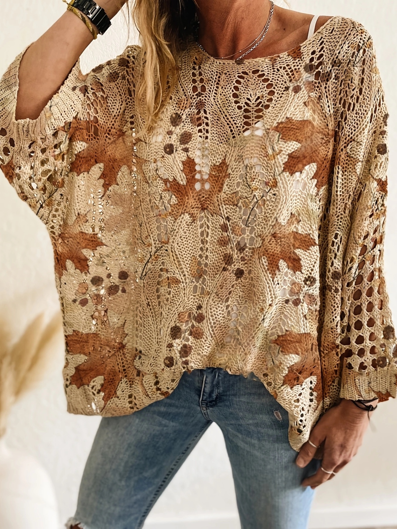 Women'S Off-Shoulder Top with Maple Leaf Print - Casual, Elegant, and Perfect for Vacation, Spring/Summer Collection, Long Sleeve, Loose Fit, Beige, Casual Wear|Elegant Offshoulder Top| Construction, Off Shoulder Top